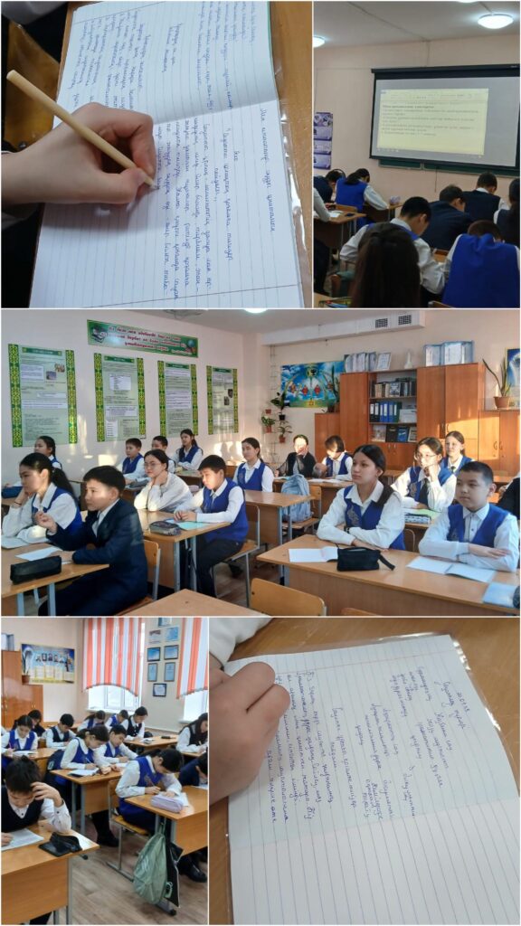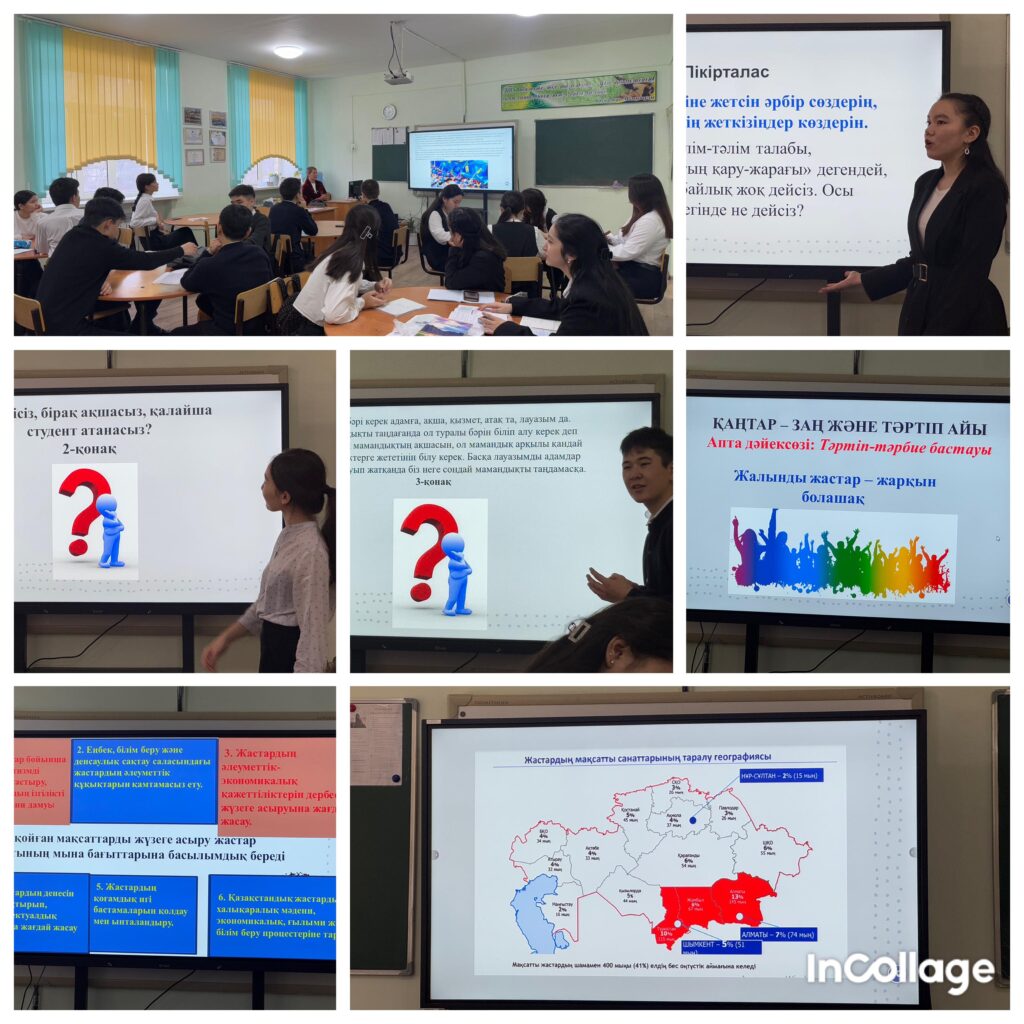 Мектебімізде бүгін оқушылардың сауаттылыққа деген қызығушылығын арттыру, білімнің маңыздылығын ұғындыру, жеке тұлғаның жан-жақты дамуына ықпал ету, жастардың бойында жауапкершілік, патриотизм және жарқын болашаққа ұмтылыс қасиеттерін қалыптастыру, белсенді азаматтық ұстанымын нығайту мақсатында «Сауатты ұрпақ — жарқын болашақ», «Саналы ұрпақтың таңдауы — оқуға құштарлығы» және «Жалынды жастар — жарқын болашақ» тақырыптарында сынып сағаттары өткізілді.
