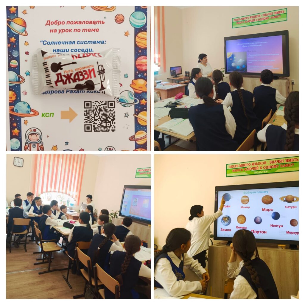 В рамках недели читательской грамотности «XXI век – век грамотного поколения!» 24 апреля 2025 г. в СШЛИ имени Жамбыла учителем русского языка и литературы Кадировой Р.К. был проведен открытый урок в 6А классе на тему «Солнечная система: наши соседи». Дети узнали о планетах солнечной системы, вспомнили о казахстанских космонавтах, побывавших в космосе и познакомились с грамматической темой урока «Виды словосочетаний».